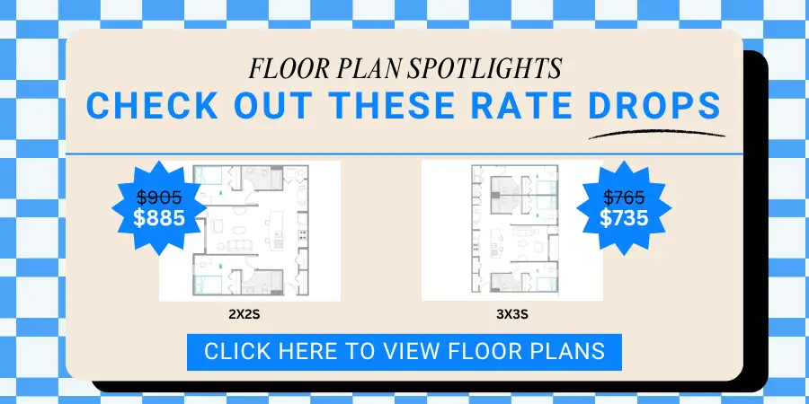 Our community amenities elevate your living experience with a clubhouse, swimming pool, fitness center, and outdoor courts for basketball and volleyball. Need to focus? Head to our computer lab with free printing or study in the coffee lounge surrounded by greenspace.